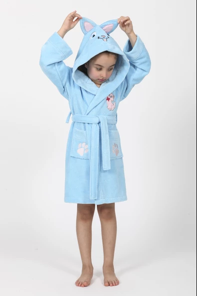 Ana Sayfa Ev Dekorasyon Ev Tekstili Banyo Tekstili Bornoz Mavi Kedi Nakış Bambu Cotton Çocuk Bornozu