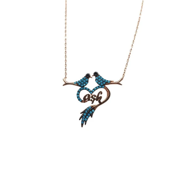 Mavi Zirkon Taşlı Altın Renk Kuş ve Kalp Figürlü Bayan Kolye