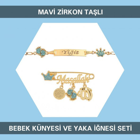 Mavi Zirkon Taşlı İsimli Bebek Künyesi ve Yaka İğnesi Seti