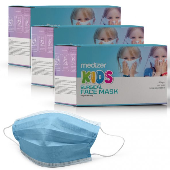 Medizer Full Ultrasonik Cerrahi ÇOCUK Maskesi 3 Katlı Spunbond Kumaş 150 Adet - Burun Telli - Mavi
