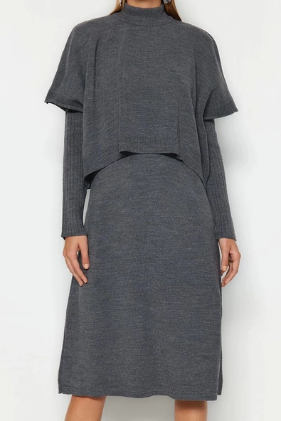 Moda Oversize Casual Günlük Bürümcük Triko Dik Yaka Uzun Kol Shift Midi Boy Elbise