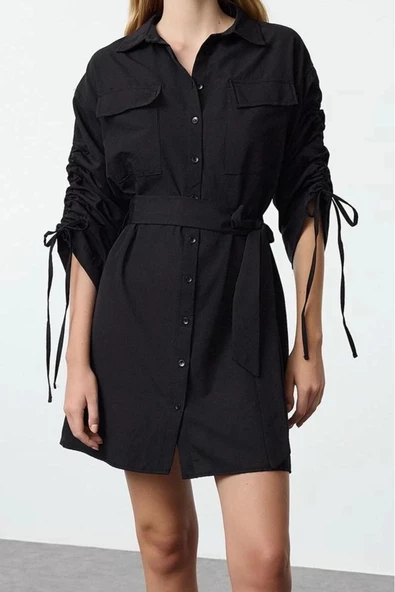 Moda Stil Regular Gömlek Yaka Mini Boy Cep ve Büzgü Detaylı Dokuma Gömlek Elbise
