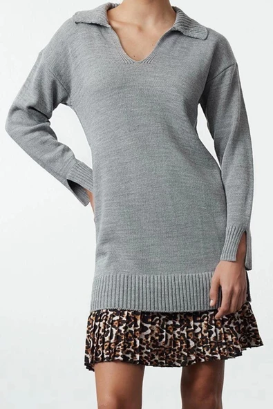Moda Stil Regular Polo Yaka Mini Boy Triko Garnili Elbise