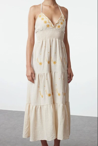 Moda Stil Regular V Yaka Midi Boy Çiçekli Dokuma Elbise