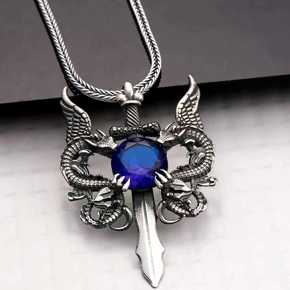 MuI MuI Gümüş Mavi Taşlı Ejderha Erkek Kılıç Kolye