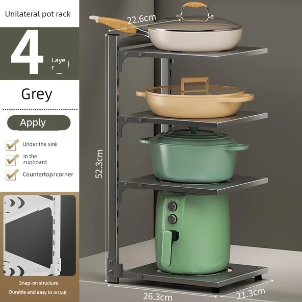 Mutfak Tencere Rafı - Tek Taraflı Metalik Gri 4 Katlı