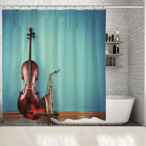 Baskılı Duş Perde Müzik Keman Saksafon Deseni