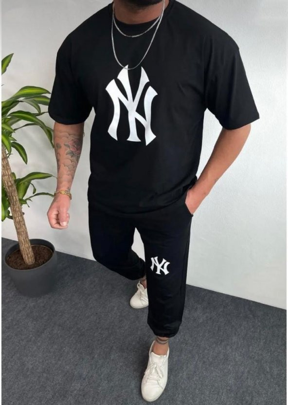 NO 601 Erkek Siyah NY Baskılı Oversize BOL KALIP Tshirt + Siyah Yazlık İnce Eşofman Altı NY Takım