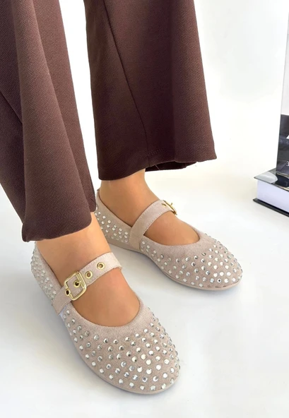 Olise Bej Boncuk İşlemeli Babet Ayakkabı