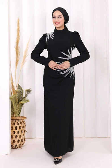 Omuz ve Bel Kısmı Taş Detaylı Abiye Elbise 3909 Siyah