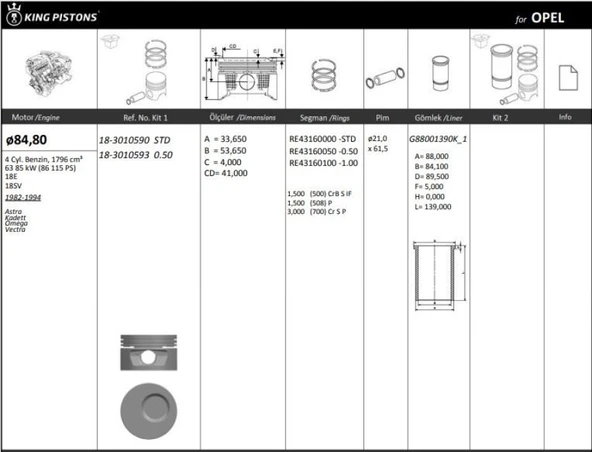 KING PISTON markası Opel Motor Piston+segmanı ( Riken ) 84,80+stdmm Cap Astra Kadett Omega Vectra 18e-18sv R 4 Benzin, 1796 - Kingpiston 18-3010590 (KINGPISTON 18-3010590 kodlu) 623435 GOETZE 8771691STD000G OEM kodlarına sahip OPEL araçları için uyumlu olan bu ürün parcayuvasi.com'da uygun fiyatlarla, hızlı ve güvenli kargo ile hizmetinizdedir.