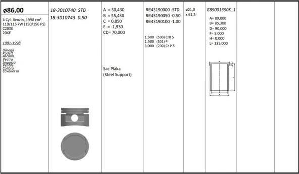 Opel Motor Piston+segmanı ( Riken ) 86,00+stdmm Cap Omega Kadett Ascona Vectra Leganza Ventile Calıbra C - Kingpiston 18-3010740