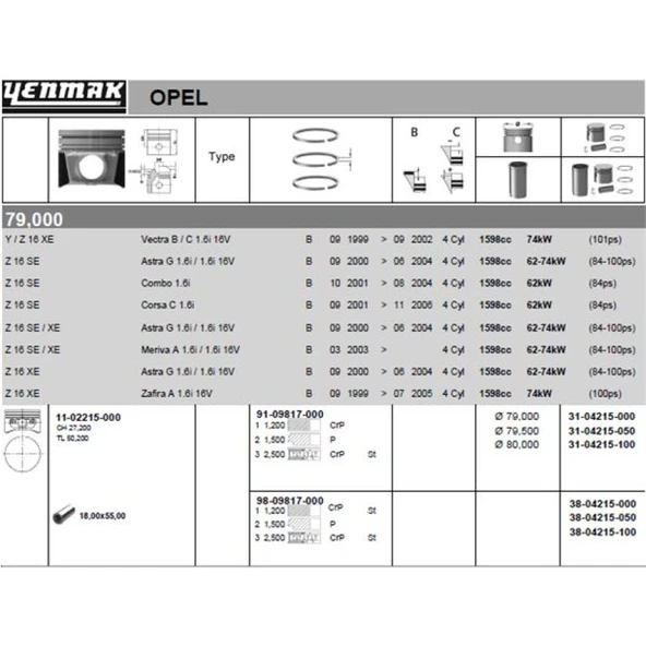 Opel Piston Segman { 1mm Farklı } Astra Meriva Vectra Zafıra Y16xe Z16xe - Yenmak 31-04215-100
