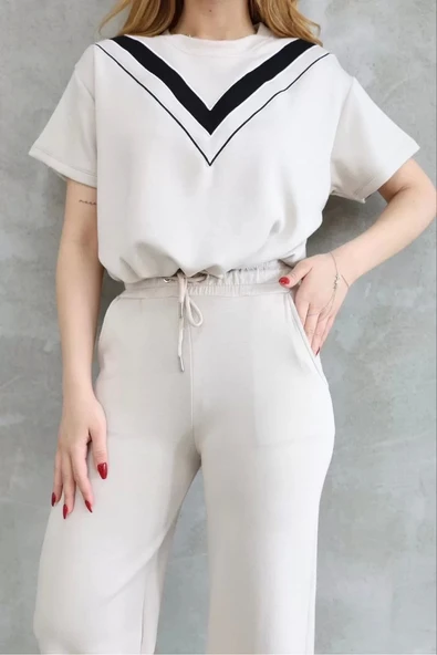 Osy Modal Yumuşak dokulu Kumaş Bisiklet Yaka Parçalı detaylı Kısa Kollu Takım - Beyaz