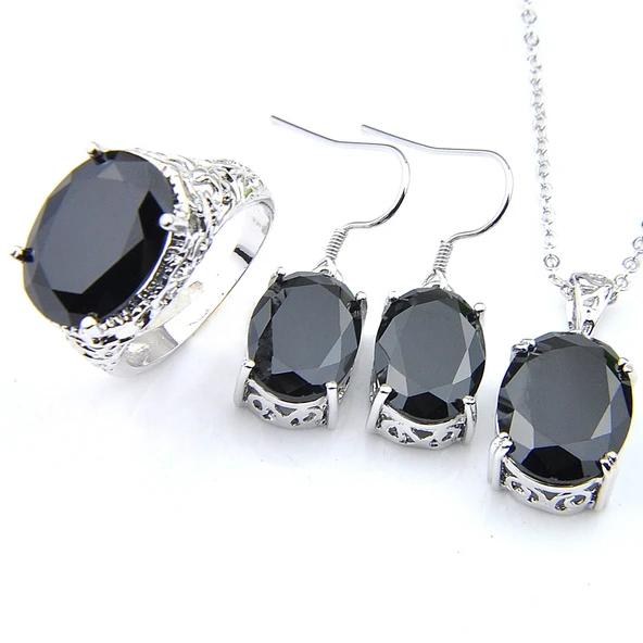 Oval Kesim Siyah Oniks Gümüş Takı Seti - Kolye, Küpe, Yüzük - Boyut 7