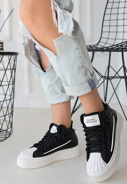 Pabucmarketi Siyah Suni Deri Bağcıklı Kadın Sneaker Kadın Ayakkabı