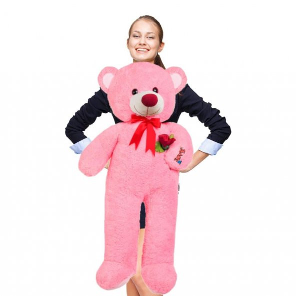 Peluş Ayı Romantik Pembe 100cm Elinde Gül Tutan Peluş Ayıcık