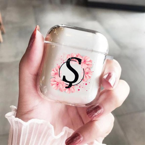 Pembe Çiçek Desenli Şeffaf AirPods Kılıfı Ş Harfli