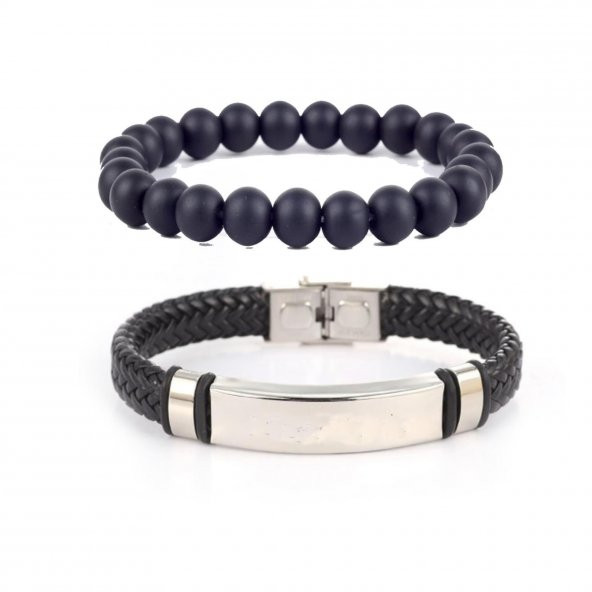 Pigado Örgü Desenli Çelik Bileklik ve Siyah Oniks Bileklik Seti