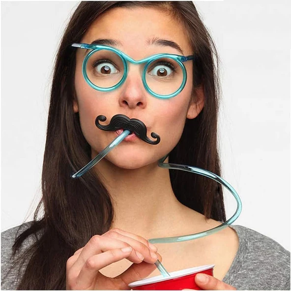 Pipetli Parti Gözlüğü - Çocuk ve Yetişkin Bıyıklı Pipet Gözlük Mavi Renk 18x14 cm