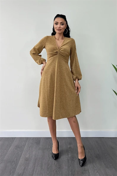 Pırıltılı Krep Kumaş Burgu Detaylı Midi Elbise - GOLD