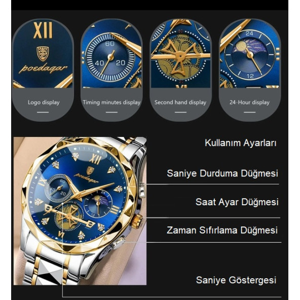 POEDAGAR Erkek Kol Saati Su Geçirmez Paslanmaz Çizilmez Çelik 005 - 11