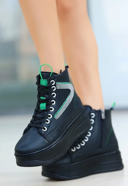 Pone Siyah Cilt Yeşil Detaylı Bağcıklı Bot