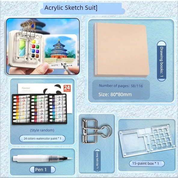Portatif Suluboya Boya Kutusu Seti - [Akrilik Seti] 15 Gözlü Boya Kutusu + 24 Renkli Boya + Küçük Resim Defteri ve Su Fırçası