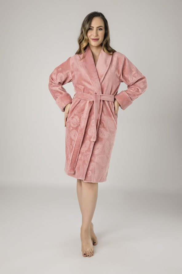 Pudra Eteği Jakarlı Bambo Cotton Bayan Bornoz