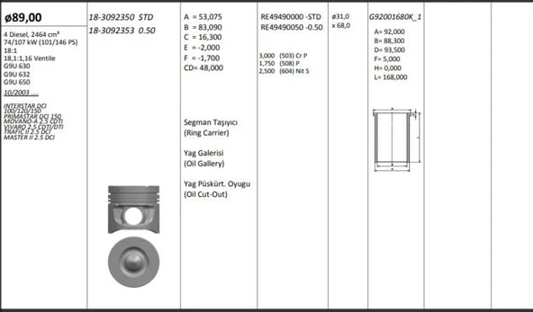 Renault Motor Piston Segman 050 Farklı İnterstar Dci*100/120/150*primastar DCI 150*movano-A 2.5 Cdti*vivaro - Kingpiston 18-3092353