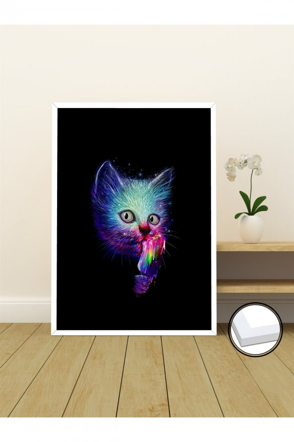 Renkli Dondurma Yiyen Kedi Dekoratif Beyaz Çerçeveli Tablo