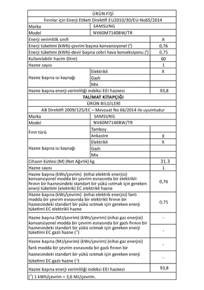 Samsung NV60M7140BW/TR 60 Lt. Beyaz Ankastre Fırın