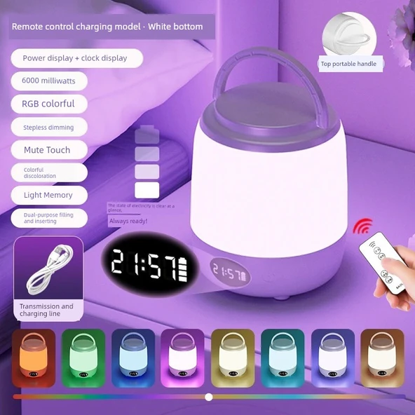 Şarj Edilebilir Dokunmatik Başucu Lambası - Uzaktan Kumandalı, Saatli, 7 Renkli, Kademesiz Dimleme + Şarj Başlığı