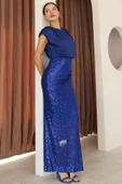 - Saten Kombinli Payetli Kalem Elbise 6044-Gece Mavisi