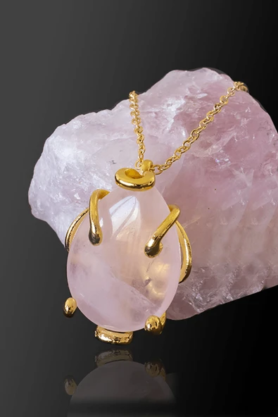 Sertifikalı AAA+ Damla Model Açık Pembe Kuvars Taşı Kolye - Altın Renkli