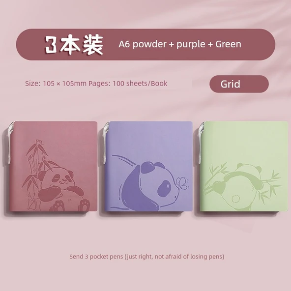 Sevimli Trompet Izgara Panda A6 Not Defteri PU Kapağı - 3 Kitap Izgara - Pembe + Yeşil + Mor