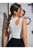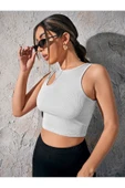 Ana Sayfa Giyim & Aksesuar Kadın Giyim Bluz Sıfır Yaka Asimetrik Kesim Beyaz Renk Desensiz Kolsuz Fitilli Likralı Fit Crop Top Bluz