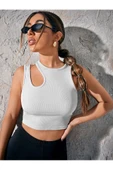 Sıfır Yaka Asimetrik Kesim Beyaz Renk Desensiz Kolsuz Fitilli Likralı Fit Crop Top Bluz
