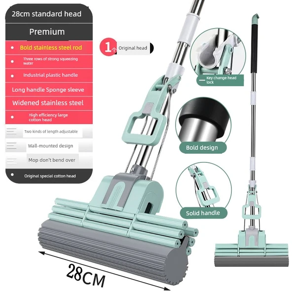 Sünger Paspas - Tek Tuşla Başlık Değişimi - 28cm Üç Sıra 1 Başlıklı (Çay Yeşili)