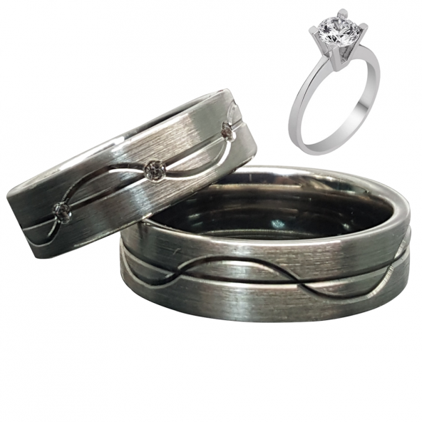 Taşlı Gümüş Çift Alyans Yüzük Tek Taş Hediyeli DN5030