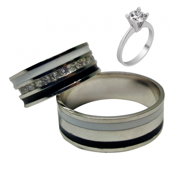 Taşlı Gümüş Çift Alyans Yüzük Tek Taş Hediyeli DN5092