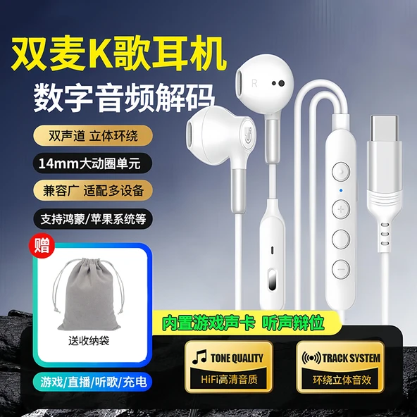 Type-C Düz Ağızlı Kulaklık - Ay Işığı Beyazı Ses Kartı Yükseltmeli Karaoke Oyun Modu