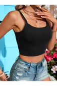 U Yaka Çapraz Askılı Siyah Renk Omuzu Sırtı Açık Kolsuz Likralı Ribana Crop Top Bluz