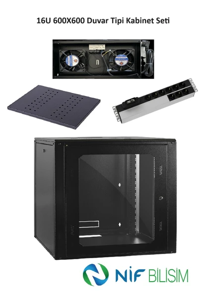 Ulusal 16U 600X600 Duvar Tip Kabinet seti 2li Duvar Tipi Fan 9lu PDU Priz 600mm Sabit Raf Dahil Set