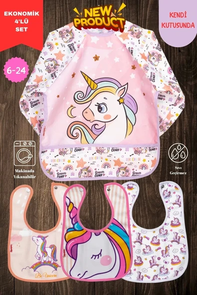 Unicorn Desen 4'lü Set Eko Sıvı Geçirmez Aktivite Ve Mama Önlüğü Kendi Kutusunda 6-24 Ay