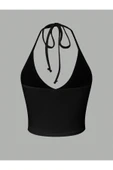 Ana Sayfa Giyim & Aksesuar Kadın Giyim Bluz V Yaka Siyah Renk Desensiz Boyun Bağlamalı Fitilli Kısa Kolsuz Likralı Fit Crop Top Bluz