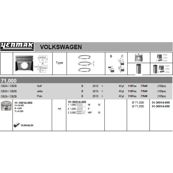 Vag Piston Segman Std 71.00 MM A1 A3 Altea İbiza Leon Toledo Fabıa Octavıa Rapıd Roomster Yeti Caddy Gol - Yenmak 31-30014-000