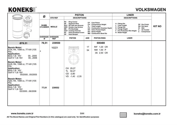 KONEKS markası Vag Piston+segman (76,51mm Std) Golf IV Bora Toledo II Leon 1,6 16v 105ps Bcb Azd Aus Atn 00>06 - Koneks 239550 (KONEKS 239550 kodlu) 036107065AH 036107065AP 036107065BS GOETZE 8772169-STD OEM kodlarına sahip VAG araçları için uyumlu olan bu ürün parcayuvasi.com'da uygun fiyatlarla, hızlı ve güvenli kargo ile hizmetinizdedir.