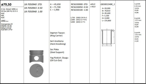 Vag Piston+segman (79,51mm Std) Golf III T4 İbiza II Toledo I Passat A80 Cordoba 1,9td Abl Aaz Ade 91>03 - Kingpiston 18-7050940