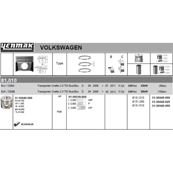 YENMAK markası Vag Piston+segman (81,01mm Std 5 Silindir) Crafter 2,5tdi (136 / 163 Ps) Bjl Bjm Ceca Cecb 06> - Yenmak 31-30045-000 (YENMAK 31-30045-000 kodlu) 076105065C 076107065A 076107065C GOETZE 8772501STD000G OEM kodlarına sahip VAG araçları için uyumlu olan bu ürün parcayuvasi.com'da uygun fiyatlarla, hızlı ve güvenli kargo ile hizmetinizdedir.